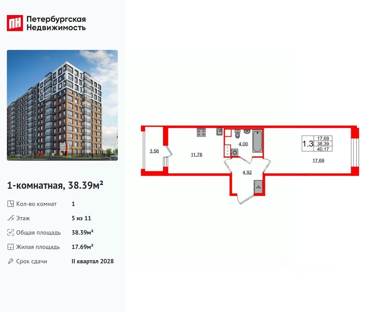 Удобная, классическая планировка, кухня 11.78 м², просторная прихожая 4.92 м². Общая площадь квартиры - 38.39 м², жилая 17.69 м², высота потолка 2.77 м.