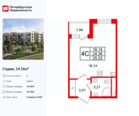 Удобная, классическая, функциональная европланировка, вместительная прихожая 3.01 м². Общая площадь студии - 24.36 м², жилая 18.14 м², высота потолка 2.77 м.