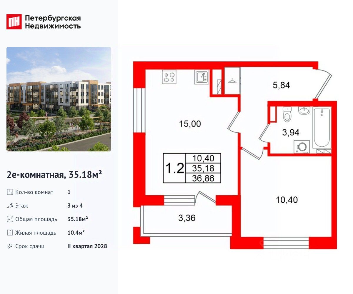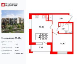 Удобная, классическая, функциональная европланировка, большая кухня-гостиная 15 м², просторная прихожая 5.84 м². Общая площадь квартиры - 35.18 м², жилая 10.4 м², высота потолка 2.77 м.