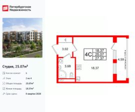 Удобная, классическая, функциональная европланировка, вместительная прихожая 3.02 м². Общая площадь студии - 25.07 м², жилая 18.37 м², высота потолка 2.77 м.