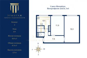 Арт. 131897196 2-к квартира у парка, 47.4 м².