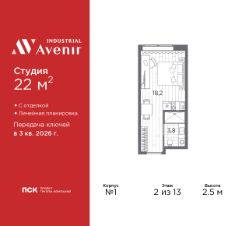 Однокомнатные апартаменты-студия с отделкой в ЖК "Industrial AVENIR" на 2 этаже. Общая площадь: 22 кв.м., площадь гостиной 18.2 кв.м., из которых 5 кв.м. выделено под кухонную зону. Все окна выходят на одну сторону. В апартаментах один совмещенный санузел. Высота потолков 2.5 м.