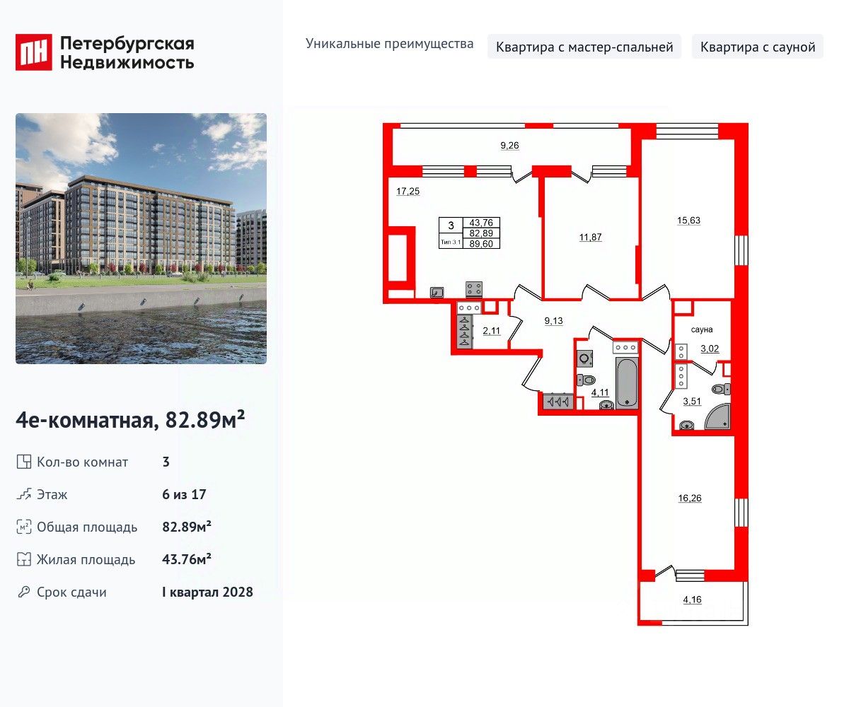 Уникальная, функциональная европланировка, большая кухня-гостиная 17.25 м², вместительная прихожая 9.13 м². Общая площадь квартиры - 82.89 м², жилая 43.76 м², высота потолка 2.77 м.