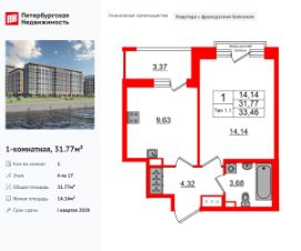 Уникальная планировка, кухня 9.63 м², просторная прихожая 4.32 м². Общая площадь квартиры - 31.77 м², жилая 14.14 м², высота потолка 2.77 м.
