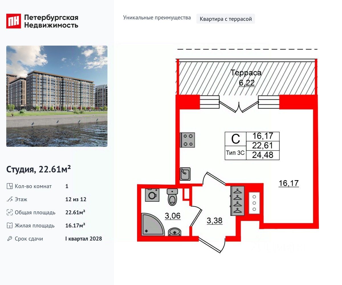 Уникальная, функциональная европланировка, просторная прихожая 3.38 м². Общая площадь студии - 22.61 м², жилая 16.17 м², высота потолка 3.04 м.