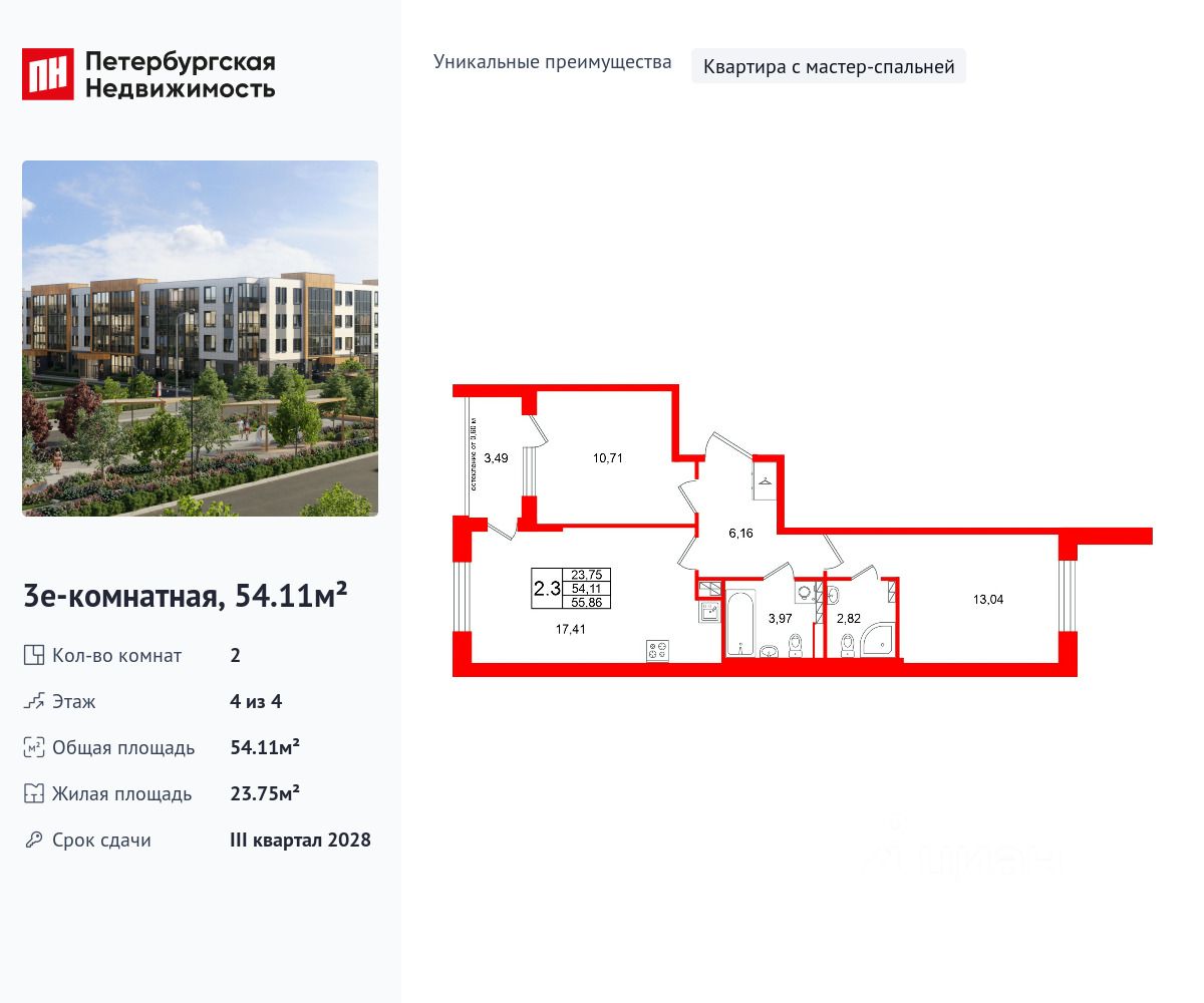 Уникальная, функциональная европланировка, большая кухня-гостиная 17.41 м², вместительная прихожая 6.16 м². Общая площадь квартиры - 54.11 м², жилая 23.75 м², высота потолка 3.07 м.
