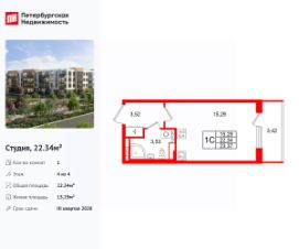Удобная, классическая, функциональная европланировка, просторная прихожая 3.52 м². Общая площадь студии - 22.34 м², жилая 15.29 м², высота потолка 3.07 м.