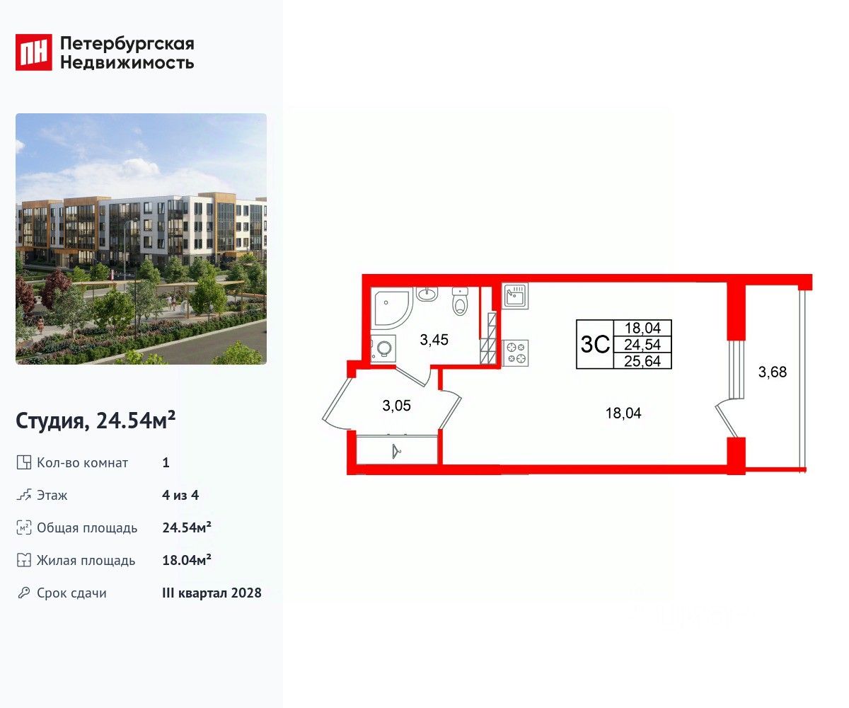 Удобная, классическая, функциональная европланировка, вместительная прихожая 3.05 м². Общая площадь студии - 24.54 м², жилая 18.04 м², высота потолка 3.07 м.