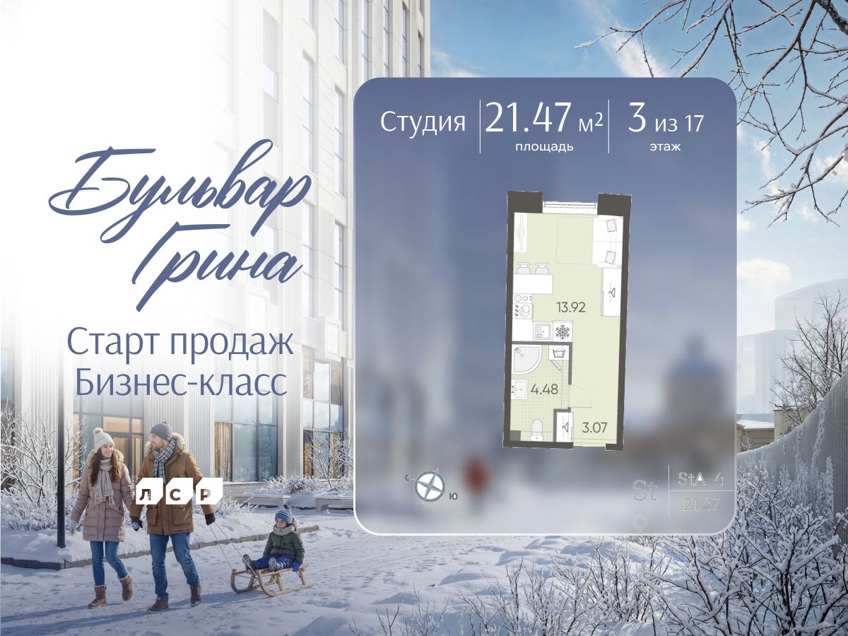 Продается студия в ЖК "Бульвар Грина" на 3 этаже. Общая площадь составляет 21.47 кв. м. Квартира с white box отделкой. Срок сдачи: 4-кв. 2028. Жилой комплекс "Бульвар Грина" располагается по адресу Санкт-Петербург, Василеостровский.
