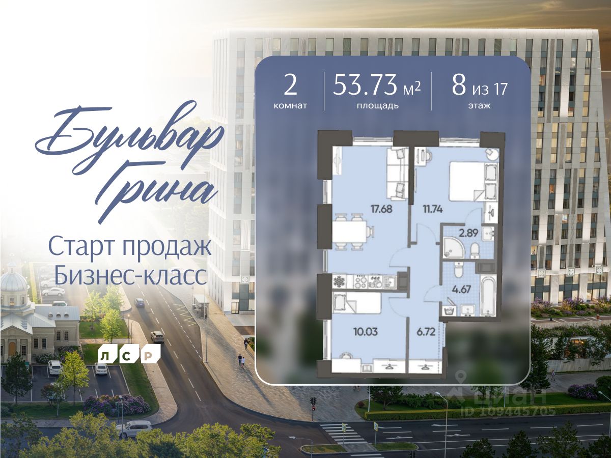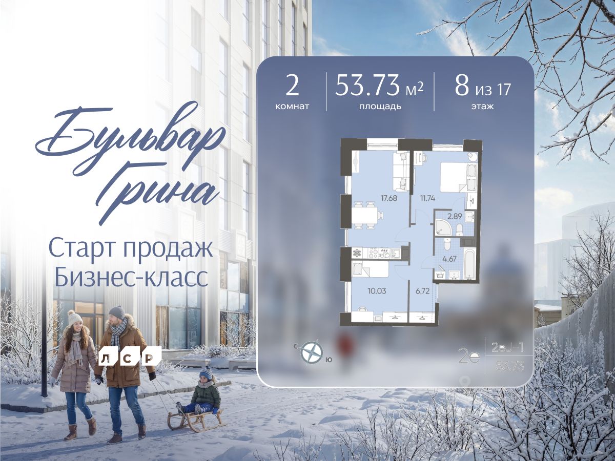 Продается 2-комнатная квартира в ЖК "Бульвар Грина" на 8 этаже. Общая площадь составляет 53.73 кв. м. Квартира с white box отделкой. Срок сдачи: 4-кв. 2028. Жилой комплекс "Бульвар Грина" располагается по адресу Санкт-Петербург, Василеостровский.
