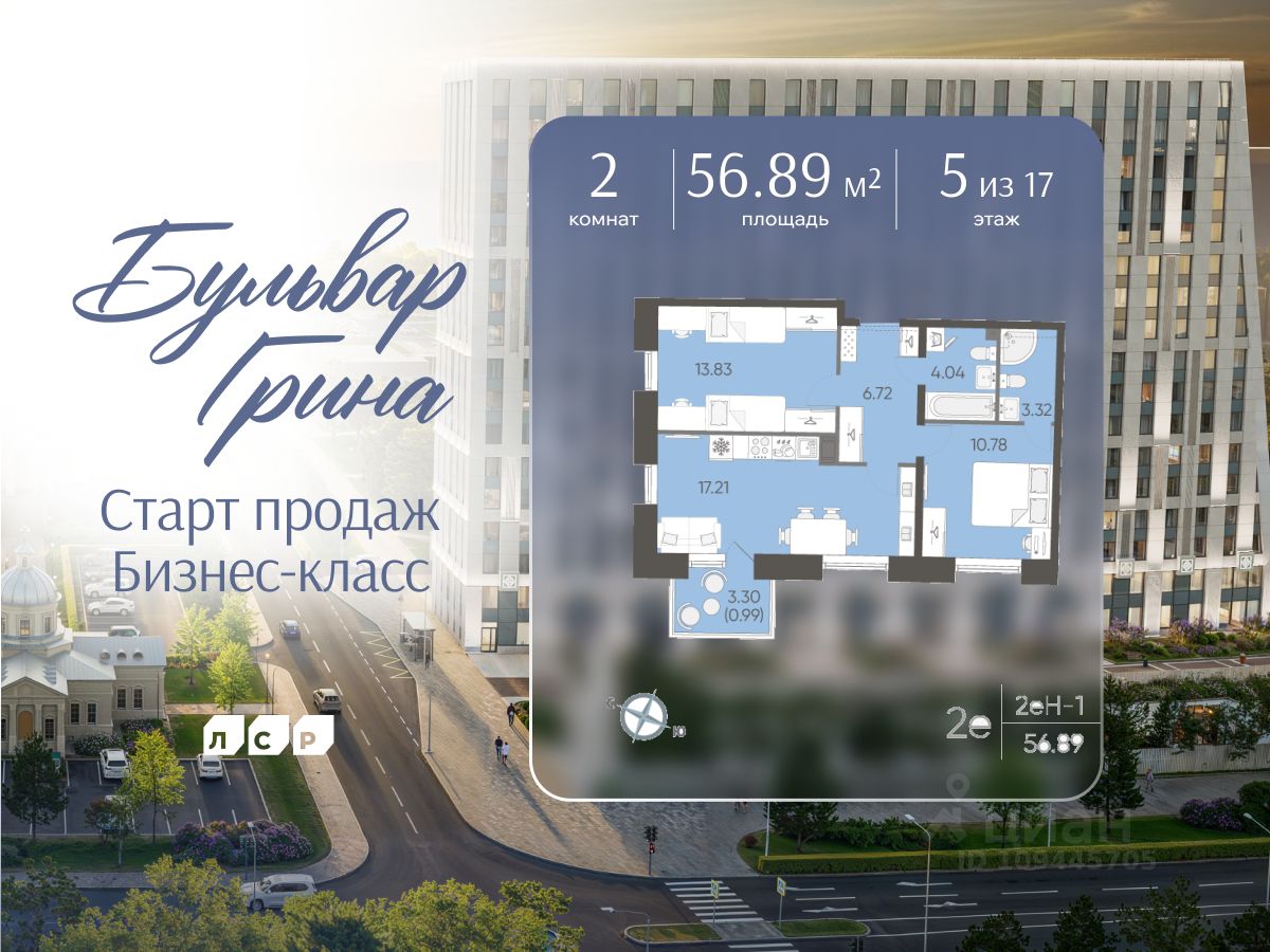 Продается 2-комнатная квартира в ЖК "Бульвар Грина" на 5 этаже. Общая площадь составляет 56.89 кв. м. Квартира с white box отделкой. Срок сдачи: 4-кв. 2028. Жилой комплекс "Бульвар Грина" располагается по адресу Санкт-Петербург, Василеостровский.