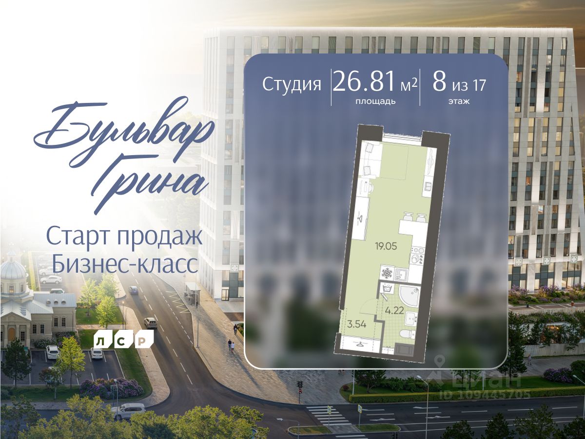 Продается студия в ЖК "Бульвар Грина" на 8 этаже. Общая площадь составляет 26.81 кв. м. Квартира с white box отделкой. Срок сдачи: 4-кв. 2028. Жилой комплекс "Бульвар Грина" располагается по адресу Санкт-Петербург, Василеостровский.