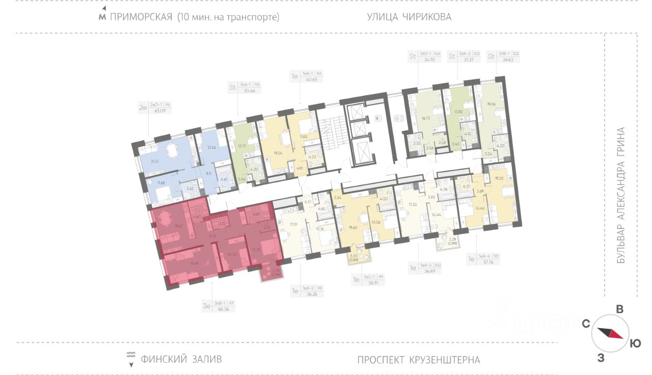Развитая сеть общественного транспорта, удобные выезды на ЗСД позволят быстро добраться в любую точку Санкт-Петербурга. В 13 минутах ходьбы в перспективе запланировано открытие станции метро "Морской фасад", что улучшит транспортную доступность локации и повысит ее инвестиционную привлекательность.