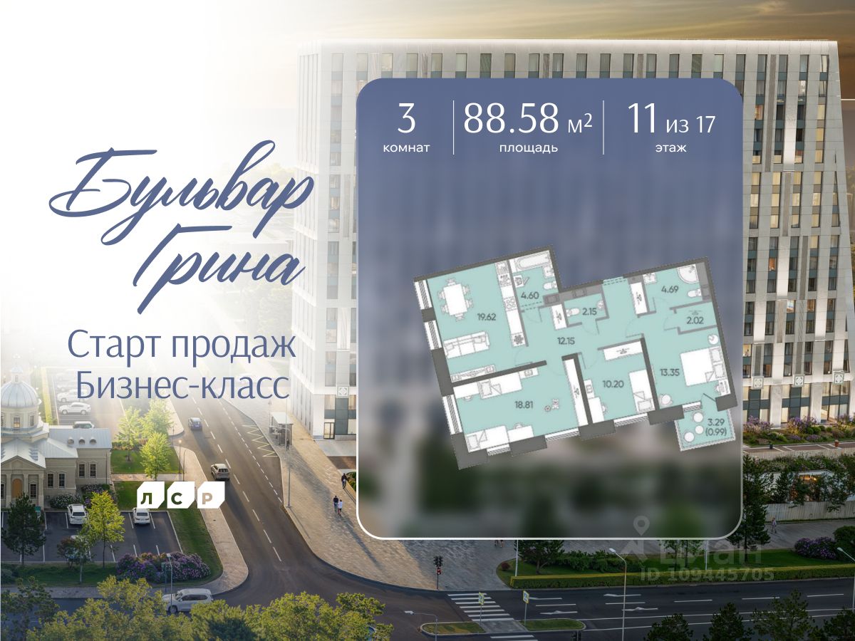Продается 3-комнатная квартира в ЖК "Бульвар Грина" на 11 этаже. Общая площадь составляет 88.58 кв. м. Квартира с white box отделкой. Срок сдачи: 4-кв. 2028. Жилой комплекс "Бульвар Грина" располагается по адресу Санкт-Петербург, Василеостровский.