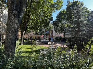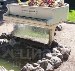 Двор с фонтаном (рояль в кустах), ландшафтным дизайном и детскими площадками.
