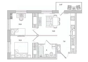 Две светлые спальни правильной формы: 10,9 м² и 10,9 м²