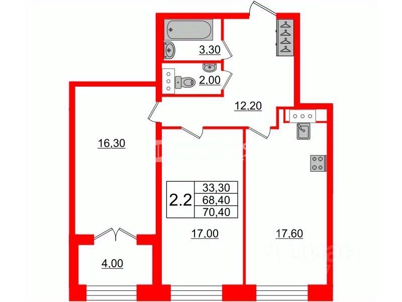 Планировка функциональная и продуманная: кухня-гостиная 17,6 м2, просторная спальня 17 м2, комната 16,3 м2 с выходом на остеклённую лоджию 4 м2 , вместительный коридор 12,2 м2, раздельный санузел 5,3 м2. Панорамные окна открывают живописные боковые виды на Неву и наполняют пространство светом.