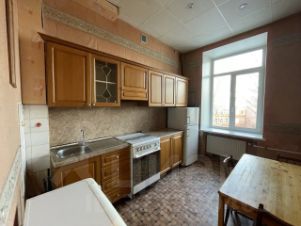 Большая комната площадью 28,1 кв.м. правильной формы с двумя окнами, паркет в хорошем состоянии, кухня 9 кв.м. правильный прямоугольник.