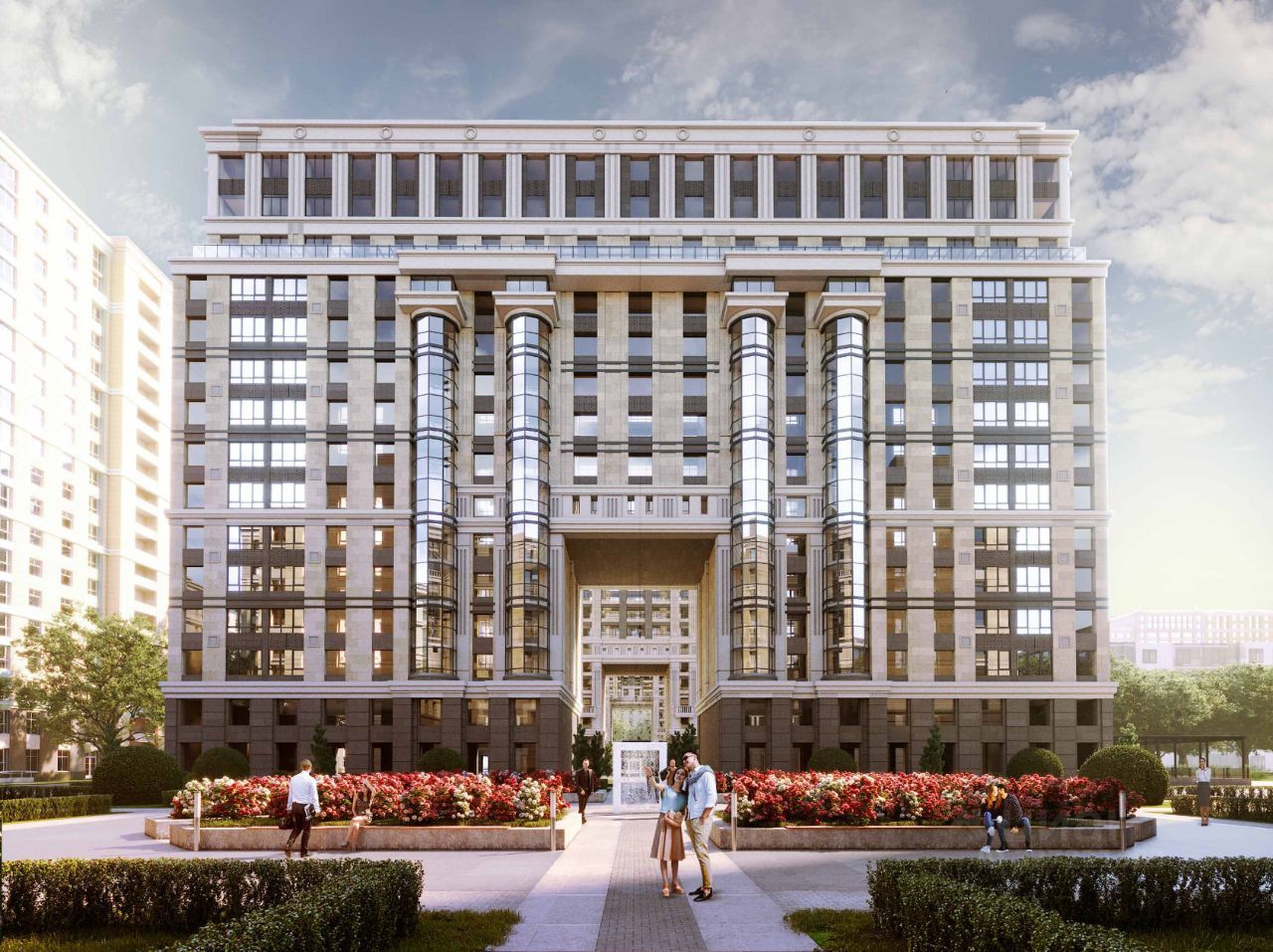 Архитектурный облик ЖК Promenade был разработан петербургскими мастерами студии "ВЕК" Владимиром Горбуновым, Евгением Федоровым и Евгением Русаковым - авторами целого ряда неоклассических зданий в Северной столице.Захватывающая дух высота арочных пролетов, строгая гармония формы и цвета, природная красота натурального камня и сдержанная роскошь декора - отличительные черты комплекса. Характерные для современности большие площади остекления органично переплетены с традиционными элементами фасада. Вертикали стеклянных эркеров складываются в античные колонны с капителью и основанием, а верхняя часть здания визуально облегчена за счет чередования остекленных поверхностей с тонкими пилястрами. Такое решение достойно продолжает диалог эпох и культур, традиционный для СанктПетербурга.
