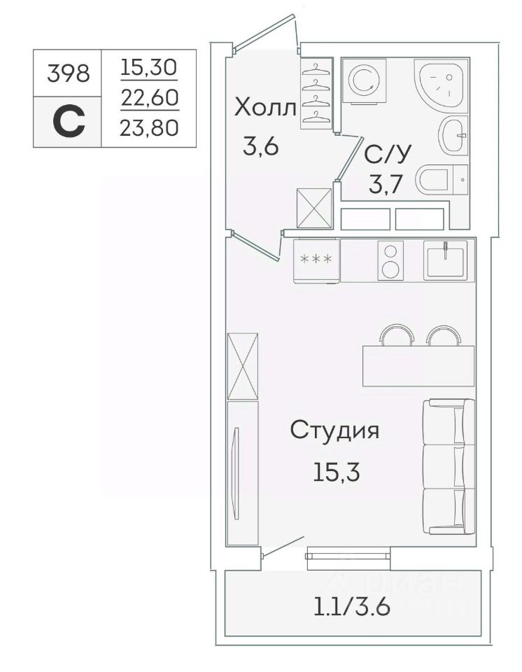 В продаже от застройщика студия 22.6 кв. м с черновой отделкой и практичной планировкой для удобной организации пространства. Корпус сдан, идет выдача ключей.