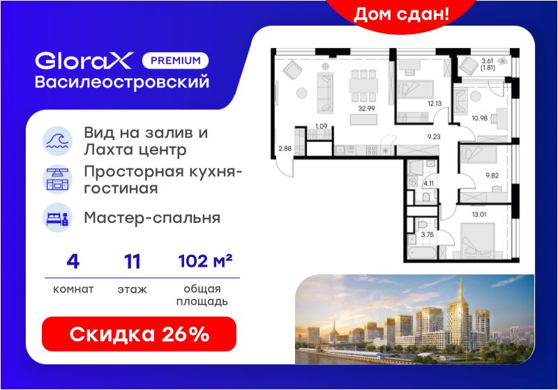Продается 4-комн. квартира на 11-м этаже в сданном проекте премиум-класса GloraX Premium Василеостровский. Общая площадь лота составляет 101,80 кв. м, из которых 45,94 кв. м отведено под жилую и 32,99 кв. м под кухонную зону. Номер квартиры - 36