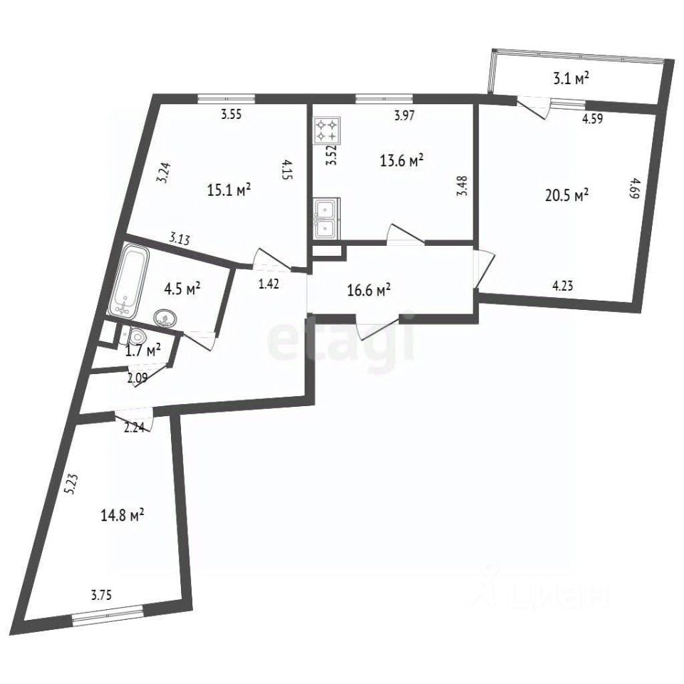 Квартира отличается редкой индивидуальной планировкой с тремя изолированными комнатами площадью 15, 16 и 21 кв.м, что идеально подходит для семьи. Просторная кухня в 14 кв.м служит комфортным местом для встреч.