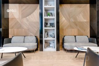 -подоконники больших окон установлены на высоте не более 50 см от пола. Оконный профиль сделан из ценного натурального материала — дуба. Снаружи рамы окрашены в тёмный графитовый цвет, а изнутри покрыты матовым лаком, что подчёркивает естественный орнамент древесины. В каждом окне установлены системы микропроветривания;