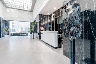 Просторная кухня с панорамным окном объединена с угловой гостиной зоной с тремя такими же огромными окнами, что делает пространство воздушным и очень светлым. Общая площадь кухни-гостиной составляет 48.5 м² и выделена в отдельное - левое крыло квартиры.