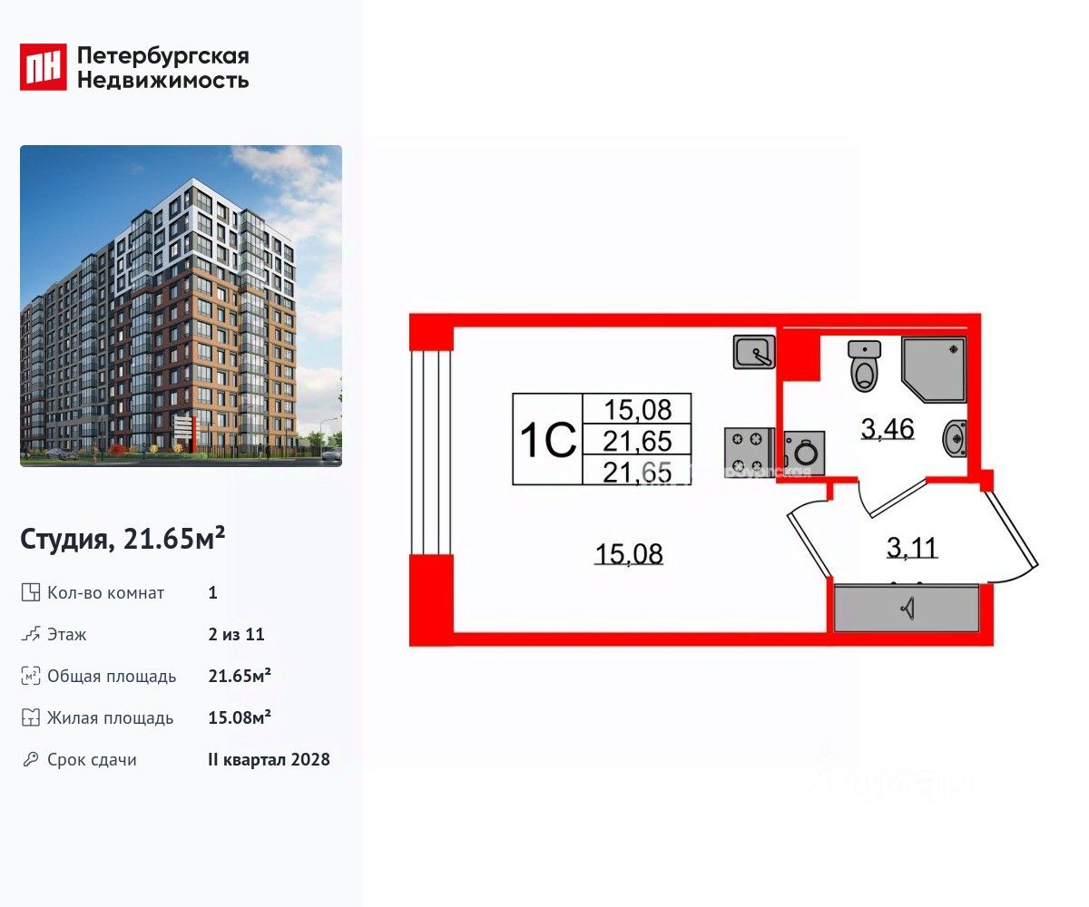 Удобная, классическая, функциональная европланировка, вместительная прихожая 3.11 м². Общая площадь студии - 21.65 м², жилая 15.08 м², высота потолка 2.77 м.