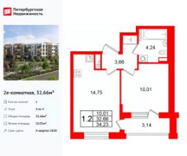 Удобная, классическая, функциональная европланировка, большая кухня-гостиная 14.75 м², вместительная прихожая 3.66 м². Общая площадь квартиры - 32.66 м², жилая 10.01 м², высота потолка 3.07 м.