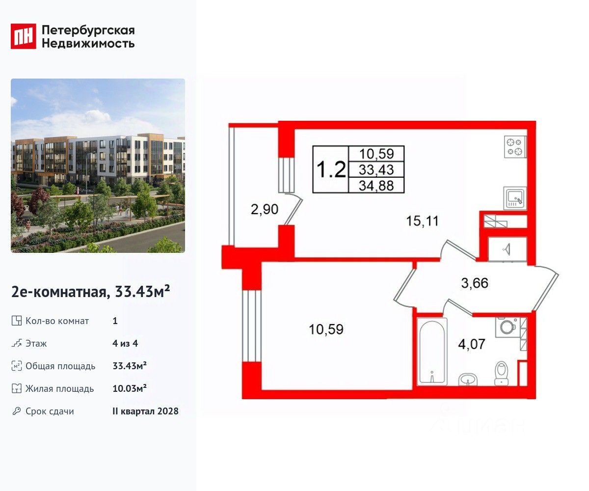 Удобная, классическая, функциональная европланировка, большая кухня-гостиная 15.11 м², вместительная прихожая 3.33 м². Общая площадь квартиры - 33.43 м², жилая 10.03 м², высота потолка 3.07 м.