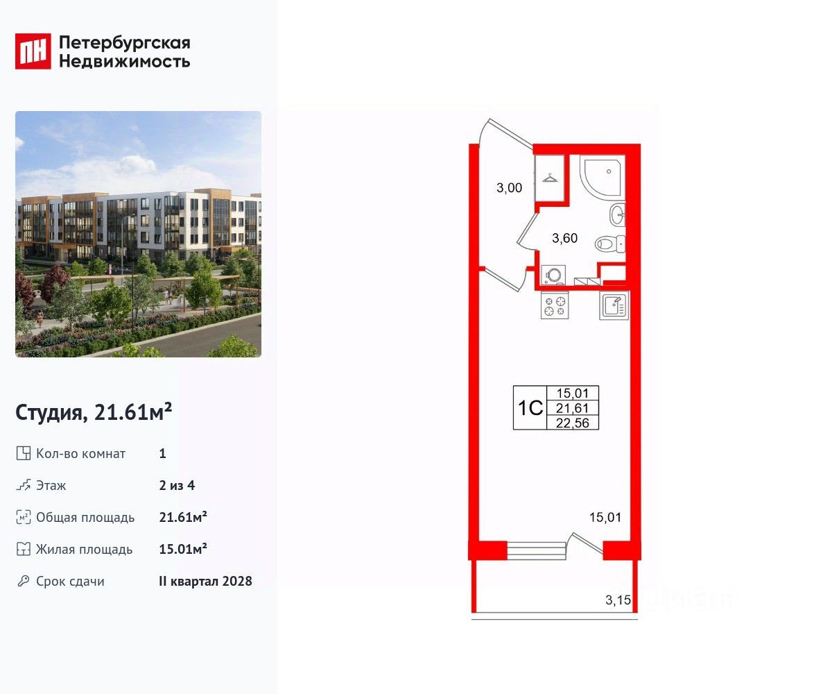 Удобная, классическая, функциональная европланировка, вместительная прихожая 3 м². Общая площадь студии - 21.61 м², жилая 15.01 м², высота потолка 2.77 м.