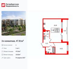 Удобная, классическая, функциональная европланировка, большая кухня-гостиная 25.3 м², просторная прихожая 6.15 м². Общая площадь квартиры - 47.81 м², жилая 10.02 м², высота потолка 2.77 м.