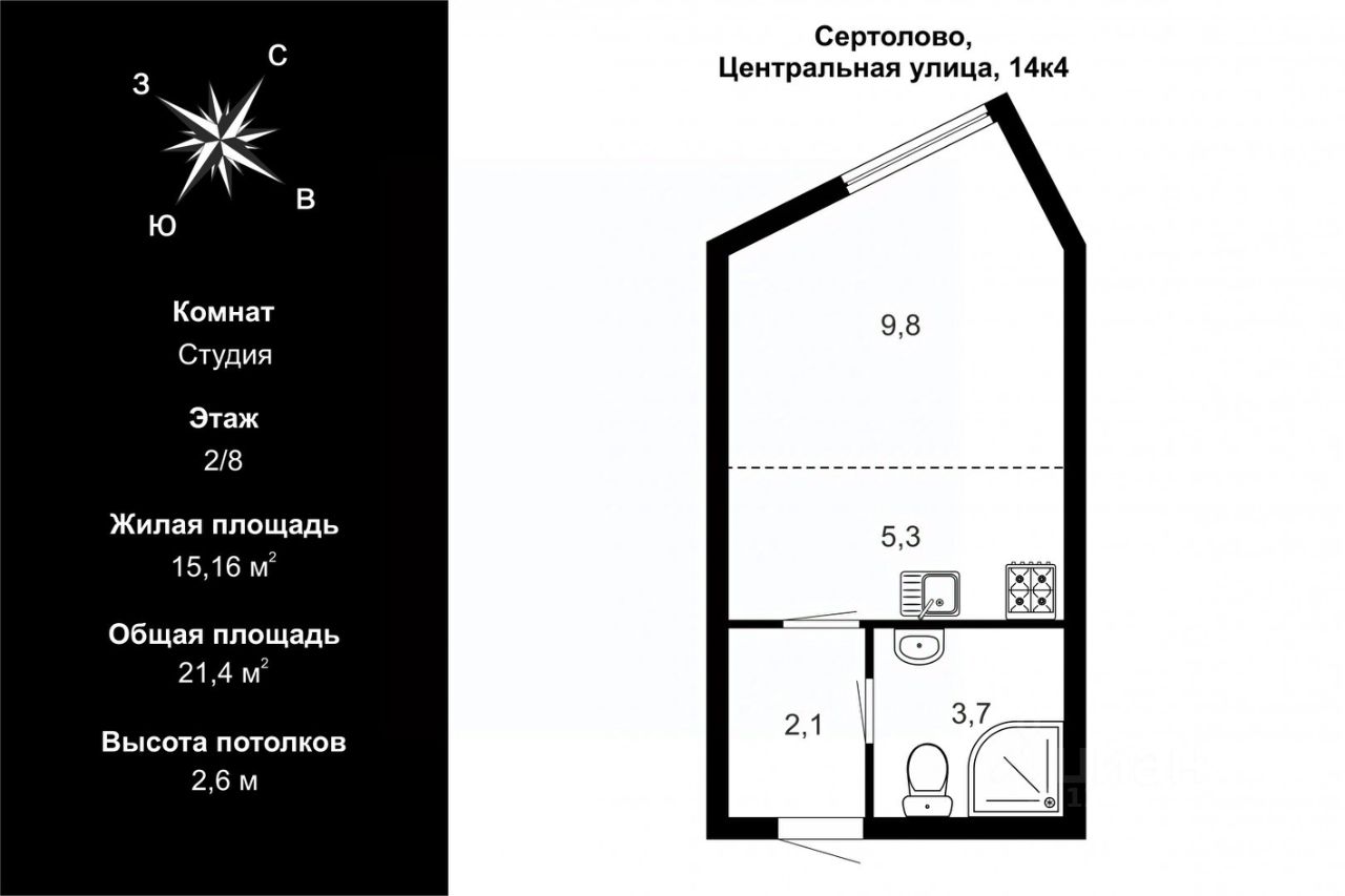 + Площадь квартиры 21,4 метра.
