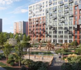 Дворы в квартале — приватные, без машин, с зелеными островками и зонами для отдыха. Вокруг школы проложен зеленый бульвар с велодорожкой. Дома высотой 11 этажей отличаются стильным фасадом в теплых оттенках с французскими балконами. В парадных — светлые лобби в европейском стиле с безбарьерной средой.