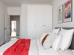 Мастер-спальня: двухместная кровать, платяной шкаф, ТВ, декор.