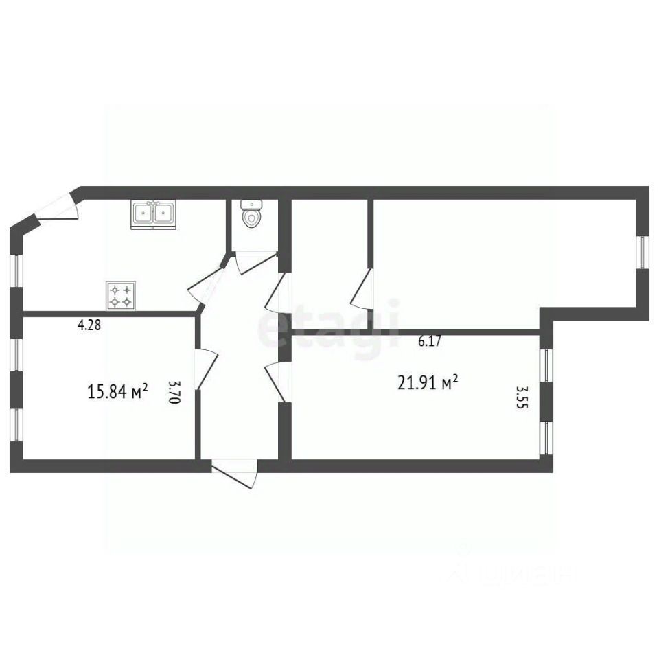 По сути, это полностью самостоятельная и очень тихая однокомнатная квартира. Планировка включает две изолированные комнаты площадью 22 и 16 квадратных метров, собственную прихожую, коридор и санузел. Одна из комнат функционально используется как кухня.