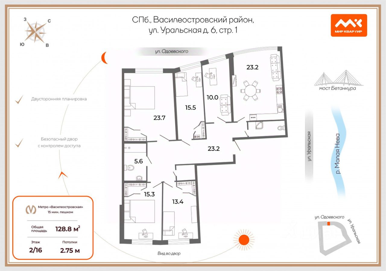 Локация с повышенной ликвидностью. 10 минут на машине до Петроградской стороны (мост Бетанкура), 13 минут до Мариинского театра (Благовещенский мост), 15 минут до Эрмитажа (Дворцовый мост). 15 минут пешком до двух станций метро на выбор "Василеостровская", "Спортивная -2"