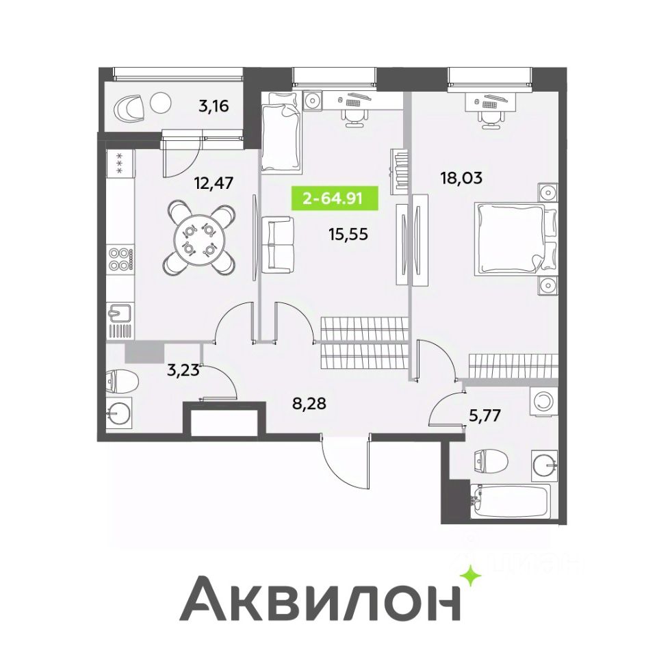 Продаётся 2-комнатная квартира в сданном доме (Аквилон Leaves), срок сдачи: I-кв. 2025, общей площадью 64.91 кв.м., на 12 этаже. Жилой комплекс "Аквилон Leaves" представляет собой 12-этажное монолитно-кирпичное здание. На территории дома предусмотрены детские игровые и спортивные площадки, зона для отдыха взрослого населения, озеленение, автостоянка и подземная парковка.