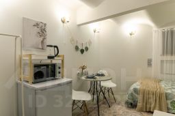 После ремонта в студии проживал один человек на протяжении месяца - так что состояние отличное. Много новых вещей: кухня, матрас, гардероб, белье, ковры, полки, тюль, декор. Ремонт производился из соображений, чтобы интерьер был устойчивым к износу и не требовал больших затрат в случае повреждений.
