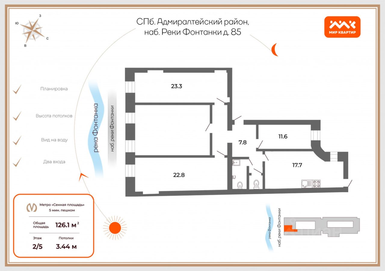 Квартира обладает двусторонней планировкой. Окна 3 комнат смотрят на набережную, просторная кухня и еще одна комната выходят в закрытый, тихий и уютный двор. За счет больших окон и высоких потолков 3,44 метра квартира наполнена воздухом и дневным светом. Всего одна несущая стена, которая делит квартиру на фасадную и дворовую части и второй вход значительно расширяют варианты использования помещения!