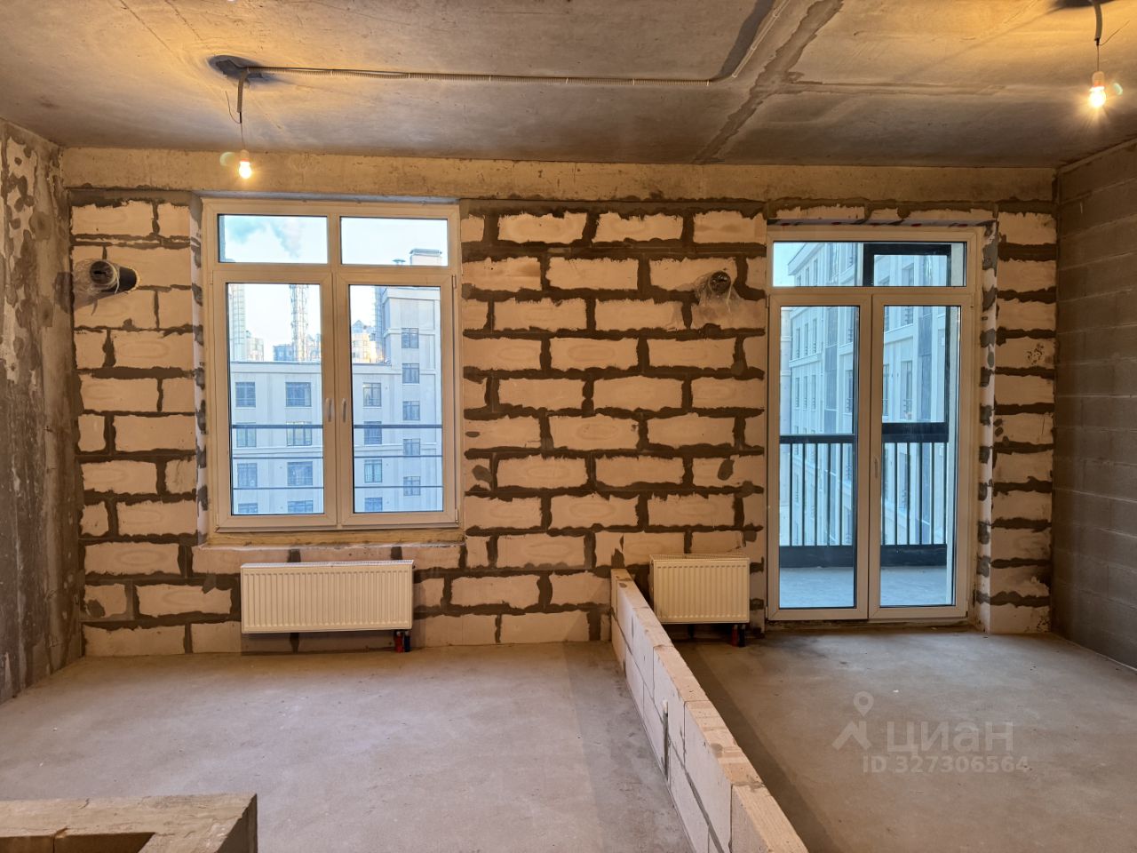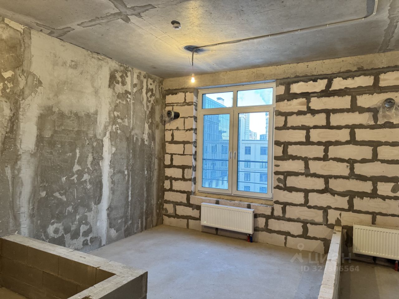 Выполнена цементно-песчаная стяжка пола, установлена входная металлическая дверь с замком, установлены стеклопакеты, сделан электрический ввод (без разводки по квартире), установлены радиаторы отопления, сделан сантехнический ввод холодной и горячей воды и точка подключения канализации без разводки по квартире, возведены межкомнатные перегородки в квартире на высоту 0,5 м от уровня пола.