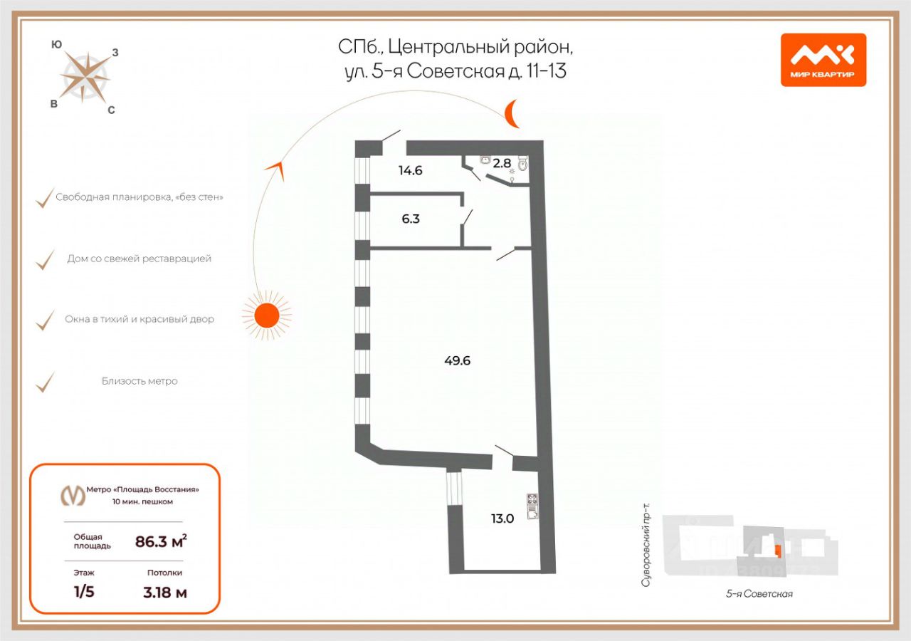 Дом находится в небольшом удалении от метро пл. Восстания, около 8-9 мин пешком, возведен в 1895 году из кирпича, перекрытия металлическими балками с деревянным наполнением. Архитектурный стиль объекта - "эклектика".