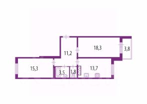 Две изолированных комнаты (18,2+15,3 м2), светлая просторная кухня (13,7 м2). Раздельный санузел. Вместительный коридор. Удобная планировка. Окна выходят во двор, тишина и свежий воздух. Благоустроенный двор с детской площадкой, школой и детским садом.
