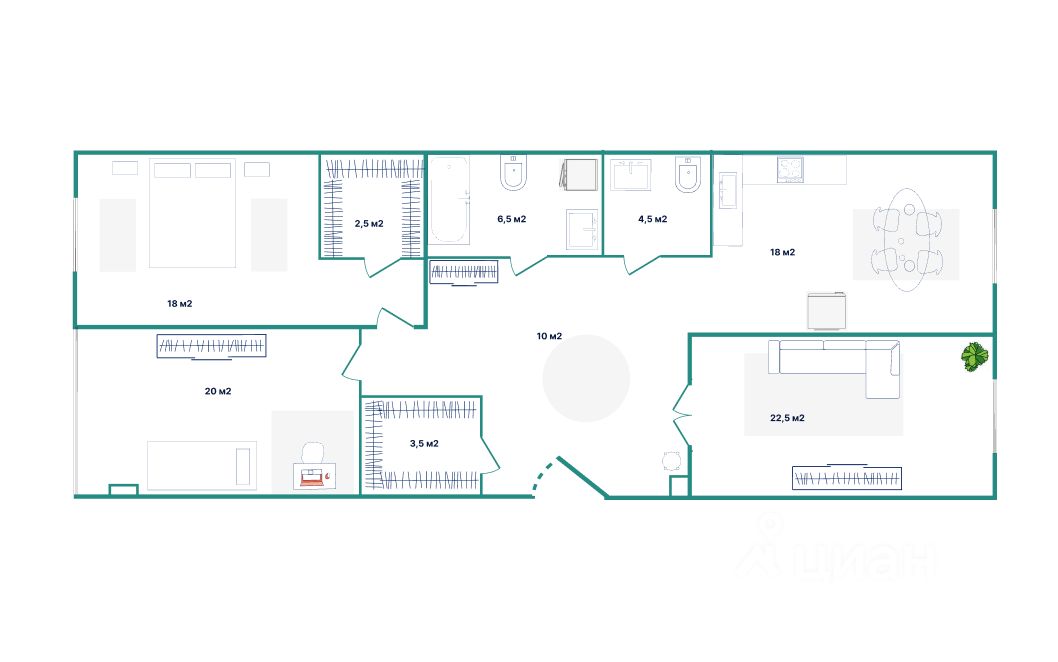 Продуманная эргономика для комфортной жизни семьи: спальня 18 м2 с гардеробом 2,5м2, детская 20м2, гостиная 22,5м2 с распашными дверями.