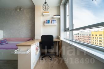 Кухня-гостиная площадью 19,5 м² объединена с лоджией, что позволило увеличить полезное пространство и наполнить помещение светом. Пространство грамотно зонировано: выделена зона приготовления и приёма пищи, а также предусмотрено отдельное рабочее место — удобное решение для удалённой работы или учёбы.