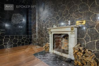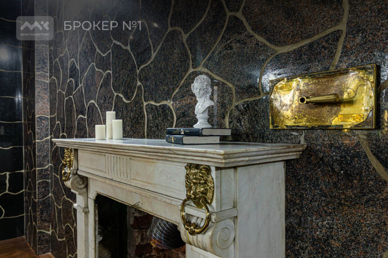 Гостиная 74м2 c камином, ценным арт-объектом и мраморными стенами;