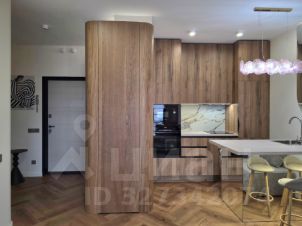• Редкое для квартир такого размера решение — кухонный остров, вокруг которого собирается вся жизнь квартиры.