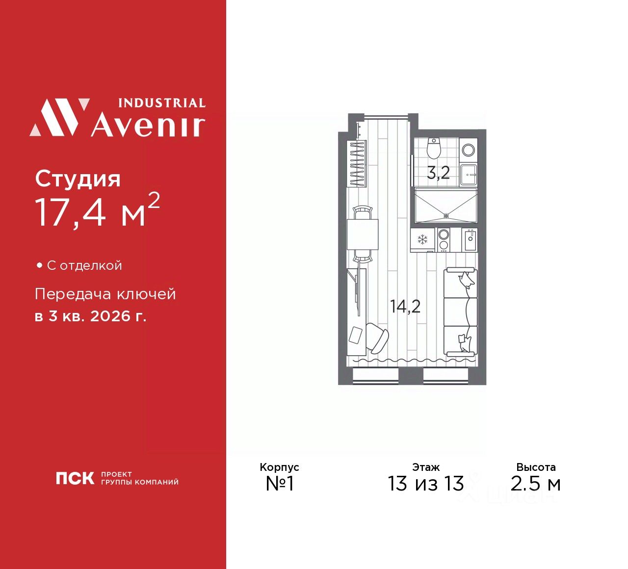 Продаются 1-комн. апартаменты-студия с отделкой в ЖК "Industrial AVENIR" на 13 этаже. Общая площадь: 17.4 кв.м., площадь гостиной 14.2 кв.м., из которых 5 кв.м. выделено под кухонную зону. Все окна выходят на одну сторону. В апартаментах один совмещенный санузел. Высота потолков 2.5 м.