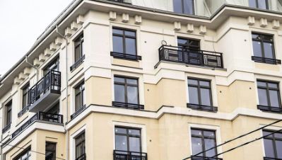Фасады привлекают внимание плавными ритмичными переходами. Вертикальная разбивка колоннами визуально устремляет здание ввысь. Плоскость фасадов декорирована разными элементами из гранита. Ограждение балконов, эркеры и колонны дополнены лаконичным геометрическим орнаментом в акцентном теплом сером цвете.